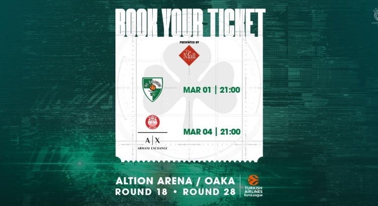 Η ΚΑΕ Παναθηναϊκός ΟΠΑΠ ενημερώνει τους φιλάθλους της πως συνεχίζεται η προπώληση των εισιτηρίων για τις αναμετρήσεις με την Zalgiris Kaunas (1/3, 21.00) και την AX Armani Exchange Milan (4/3, 21.00).