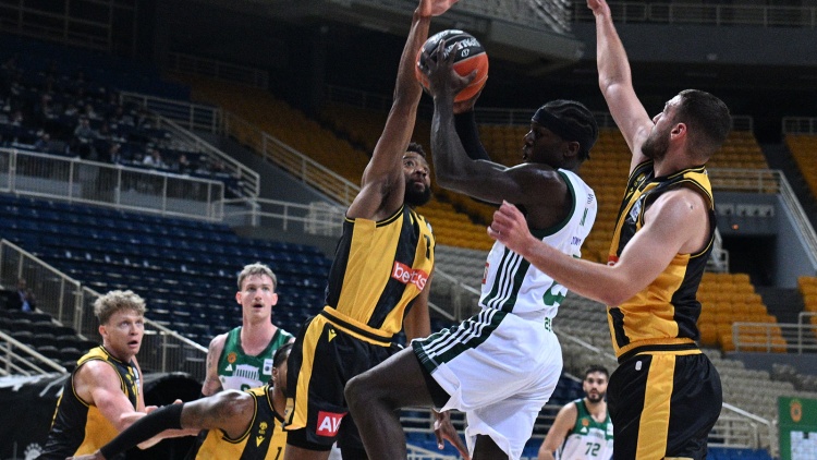 Ύστερα από τρία λεπτά στην πρώτη περίοδο ο Παναθηναϊκός διατηρούσε βραχεία κεφαλή (7-6) σε ένα παιχνίδι που είχε πάρει από νωρίς γρήγορο ρυθμό, βάζοντας σε δεύτερη μοίρα τις άμυνες. Το πρώτο προβάδισμα της ΑΕΚ στο ματς ήρθε στο 5’ (9-10), με τον Τίλμαν να έχει πετύχει και τους 10 πόντους της «Ένωσης»! Οι «πράσινοι» ανέκτησαν άμεσα το προβάδισμα (18-12 στο 7’) βάζοντας στην επιθετική τους εξίσωση τους Βιλντόζα και Γκριγκόνις, ενώ στην άλλη άκρη του παρκέ εκμεταλλεύονταν τις καλές άμυνες των Μπαλτσερόφσκι και Μαντζούκα. Ο Μάκλεμορ, που είχε περάσει νωρίτερα στο ματς κράτησε επιθετικά τους φιλοξενούμενους, έχοντας έξι πόντους με 2/2 τρίποντα, αλλά ο Γκριγκόνις (9 πόντους) είχε τον τελευταίο λόγο στην πρώτη περίοδο διαμορφώνοντας το 25-18 με τη λήξη.