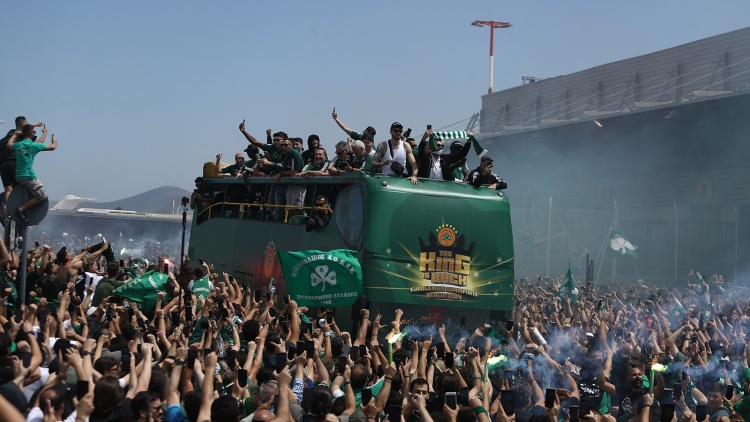 Το λεωφορείο αφού πέρασε μέσα από το κοινό, στη συνέχεια μέσω συνοδείας κατευθύνθηκε προς το Parking 5 του ΟΑΚΑ, για νέο γλέντι, τόσο με τους οπαδούς που είχαν ακολουθήσει το λεωφορείο, όσο και με εκείνους που είχαν συγκεντρωθεί εκεί εξαρχής.