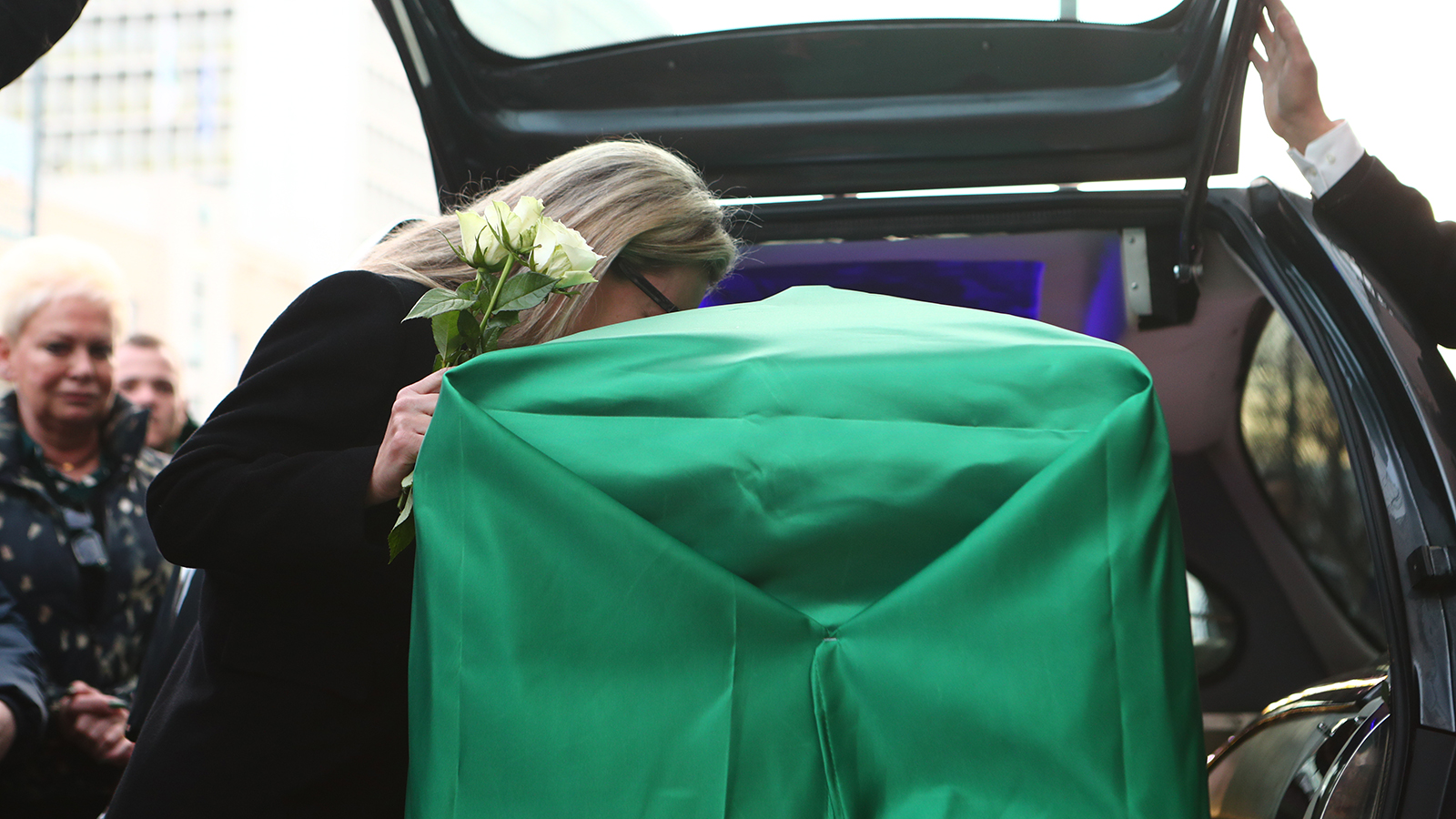 Εκεί, μεταξύ άλλων βρισκόταν και η κόρη του, Πόπη, η οποία άφησε δύο λουλούδια πάνω στο φέρετρο το οποίο ήταν τυλιγμένο με τη σημαία του Παναθηναϊκού.