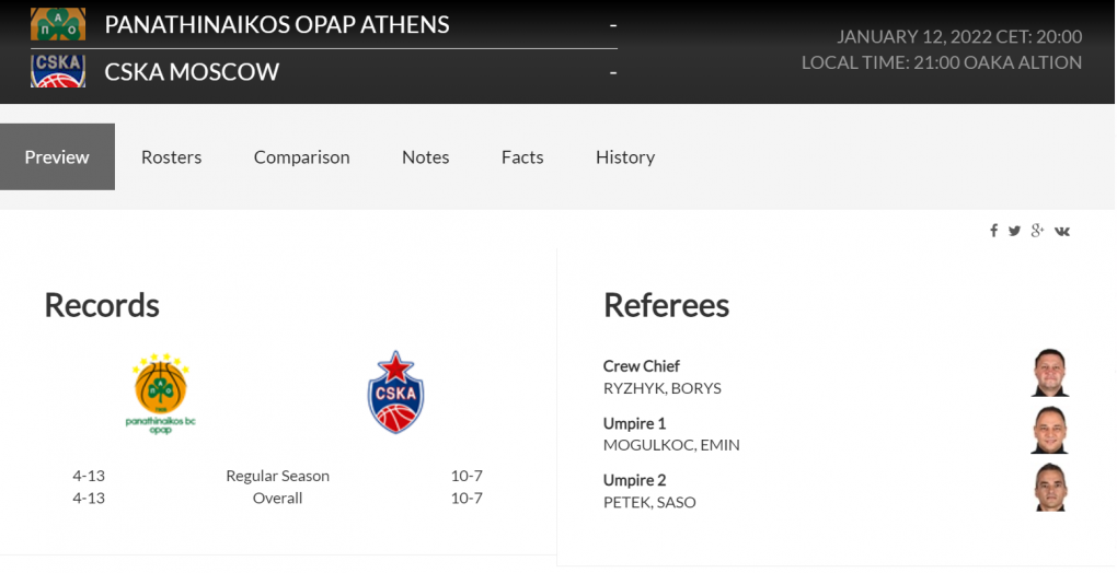 Τους διαιτητές που θα σφυρίξουν στον αγώνα του Παναθηναϊκού κόντρα στην ΤΣΣΚΑ Μόσχας στο πλαίσιο της 20ης αγωνιστικής της Euroleague, ανακοίνωσε η διοργανώτρια αρχή.
