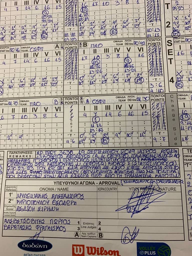 Ερωτηθής ο γενικός διευθυντής της ΚΑΕ, αν υπάρχει τεχνικός εξοπλισμός για τη συνέχιση του αγώνα, η απάντηση ήταν αρνητική: "ΟΧΙ". Έχοντας υπόψην όλα τα ανωτέρω και βάσει του άρθρου 20 του κανονισμού παιδείας (απώλεια αγώνος λόγω υπαιτιότητας) ο αγώνας διεκόπη με υπαιτιότητα της ομάδας Α', με τελικό σκορ 0-20. Ακολουθεί έκθεση».