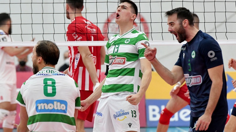Οι δύο ομάδες ξεκίνησαν με νευρικότητα στο πρώτο σετ, με τον Παναθηναϊκό να παίρνει για πρώτη φορά προβάδισμα με 5-6 έπειτα από τον πρώτο άσσο του Χ. Ανδρεόπουλου. Οι «ερυθρόλευκοι» ωστόσο βρήκαν λύσεις από τους Πέριτς και Τέπαν για να προσπεράσουν (10-7), όπως και οι «πράσινοι» για να ισοφαρίσουν σε 12-12, επιστρατεύοντας το μπλοκ τους. Το σετ συνέχισε να πηγαίνει πόντο-πόντο μέχρι το σημείο, όπου το «τριφύλλι» έπαψε να είναι αποτελεσματικό στην επίθεση επιτρέποντας στους γηπεδούχους να πάρουν διαφορά πέντε πόντων (19-14). Ο Πρωτοψάλτης πήγε στο σερβίς και οι φιλοξενούμενοι έβγαλαν αντίδραση μειώνοντας αρχικά σε 22-21, ενώ με καλά σερβίς από τον Ράπτη και μπλοκ άουτ του Βαν Ντεν Ντρις έγινε το 23-23. Οι λεπτομέρειες ήταν με την πλευρά του Παναθηναϊκού που έκανε την ολική ανατροπή και με 27-29 πήρε το πρώτο σετ κάνοντας το 0-1.