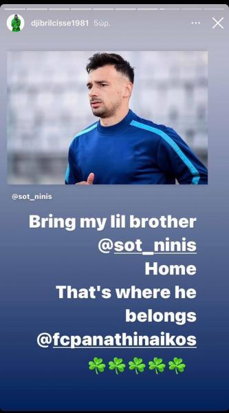 Έτσι ο Σισέ ζήτησε από τους «πράσινους» την επιστροφή του Νίνη στην ομάδα γράφοντας: «Φέρτε πίσω τον μικρό μου αδελφό, Σωτήρη Νίνη. Εκεί ανήκει, στον Παναθηναϊκό».